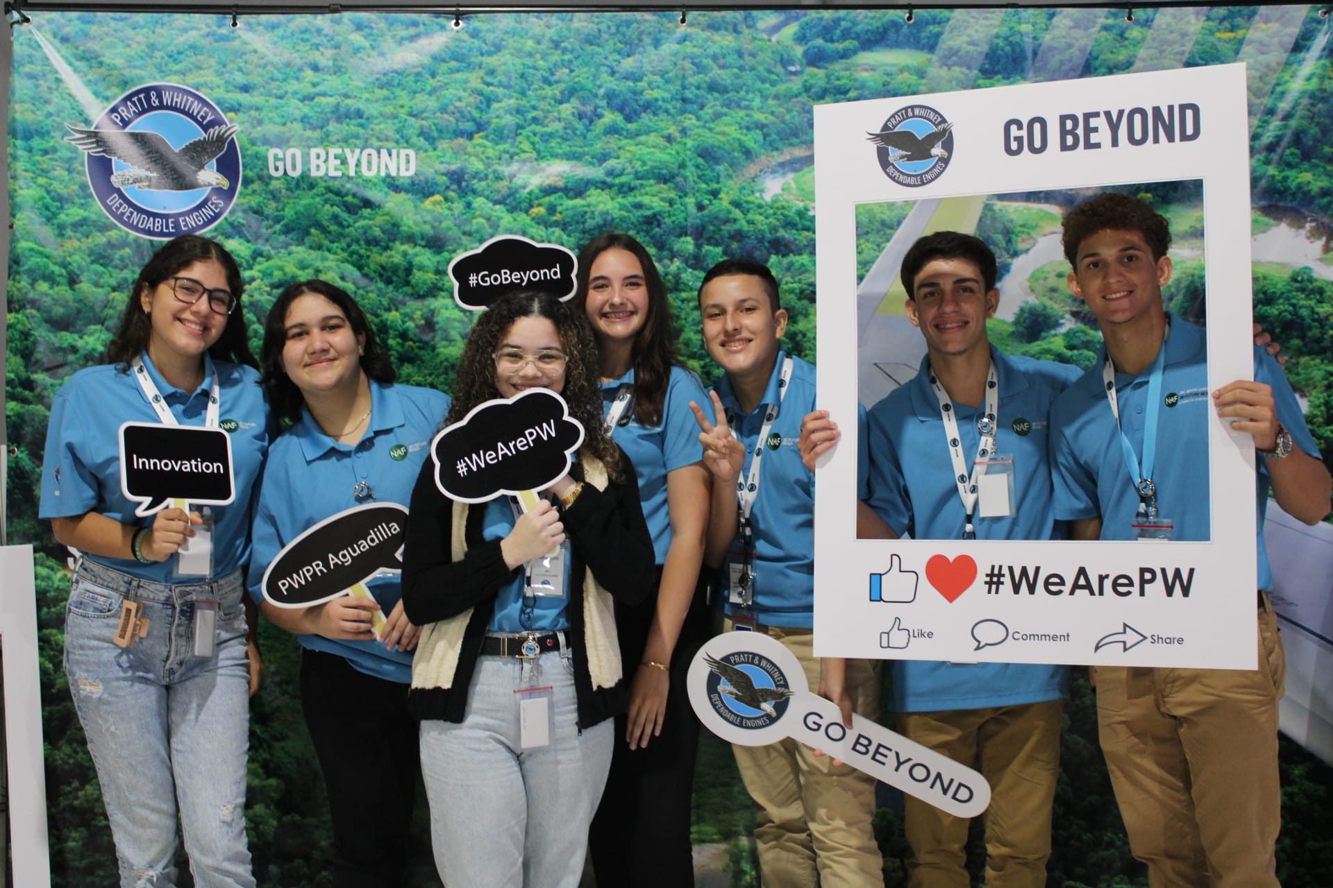 NAF students Camila Perez, Daynaliz Mejias, Vitoria Suarez, Juliany Morciglio, Jared Portalatin, Jean-Carlo Feliciano and Jadiel Hernandez completed on-site internships at the Aguadilla, Puerto Rico site of Pratt & Whitney.