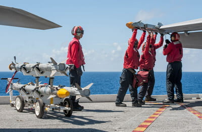 Sailors remove an AIM-9X® SIDEWINDER® air-to-air missile from an F/A-18F Super Hornet on the flight deck of the of the U.S. Navy’s only forward-deployed aircraft carrier, USS Ronald Reagan (CVN 76). (Photo: U.S. Navy)