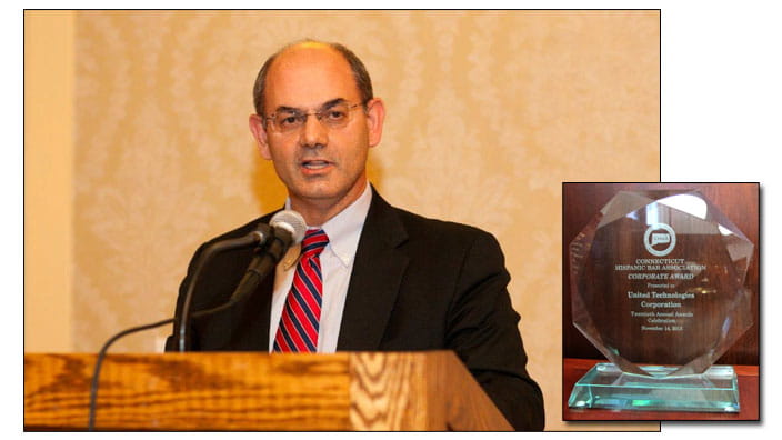 At a recent ceremony, United Technologies was recognized by the Connecticut Hispanic Bar Association (CHBA) with a "Corporate Award" for outstanding support of legal diversity events and initiatives. Joe Santos, vice president and general counsel, Pratt & Whitney, accepted the award on UTC's behalf.