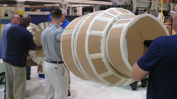 Team members used a cardboard engine that was built to scale to accurately simulate work flow. Space requirements were determined for submodule, super module and engine level processes. The mockups were fully compatible when assembled.