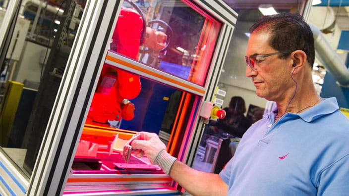 "We would not be able to keep up with the ramp in production without the innovations in technology being implemented. We're producing higher quality parts faster, leaner and safer," said Bart Palmieri, a member of the Next-Generation Robotics Team and coatings engineer in the Turbine Module Center. "The state-of-the-art technology has features programmed in, to provide safety to the operator. The use of light curtains and cameras enables the selection of the airfoil as well as prevents the operator from occupying the same space as the robot at the same time, avoiding the risk of injury."