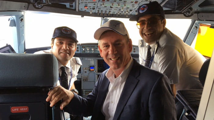 Tom Prete, vice president, Engineering, took a two-hour passenger flight from New Delhi to Bangalore, India, on July 11 aboard an A320neo powered by Pratt & Whitney's PurePower® Geared Turbofan™ PW1100G-JM engine. Prete is in India this week meeting customers and suppliers, inaugurating a Center of Excellence with Cyient and opening three e-learning centers for local students sponsored by Pratt & Whitney, UTC and supplier partners.